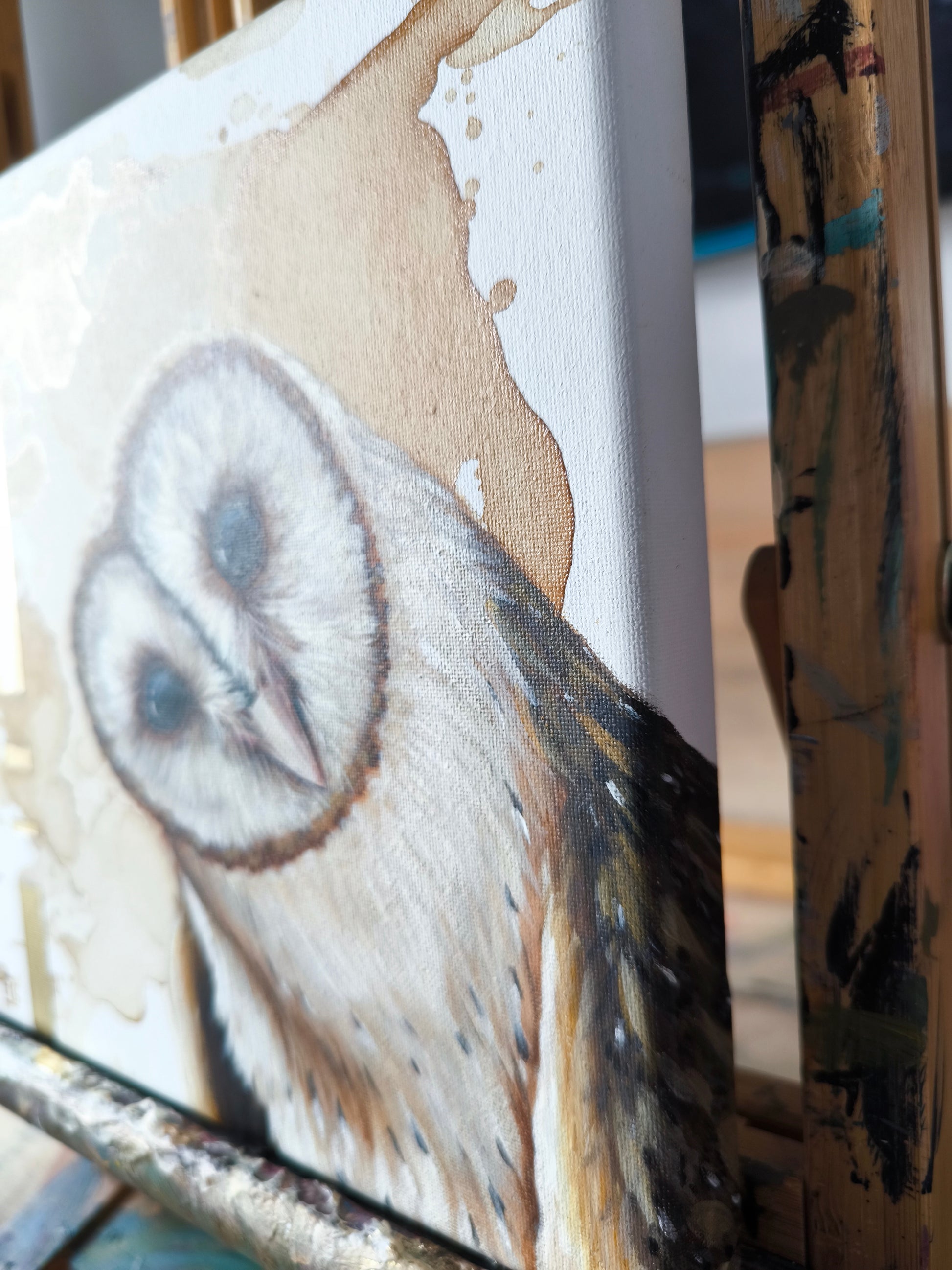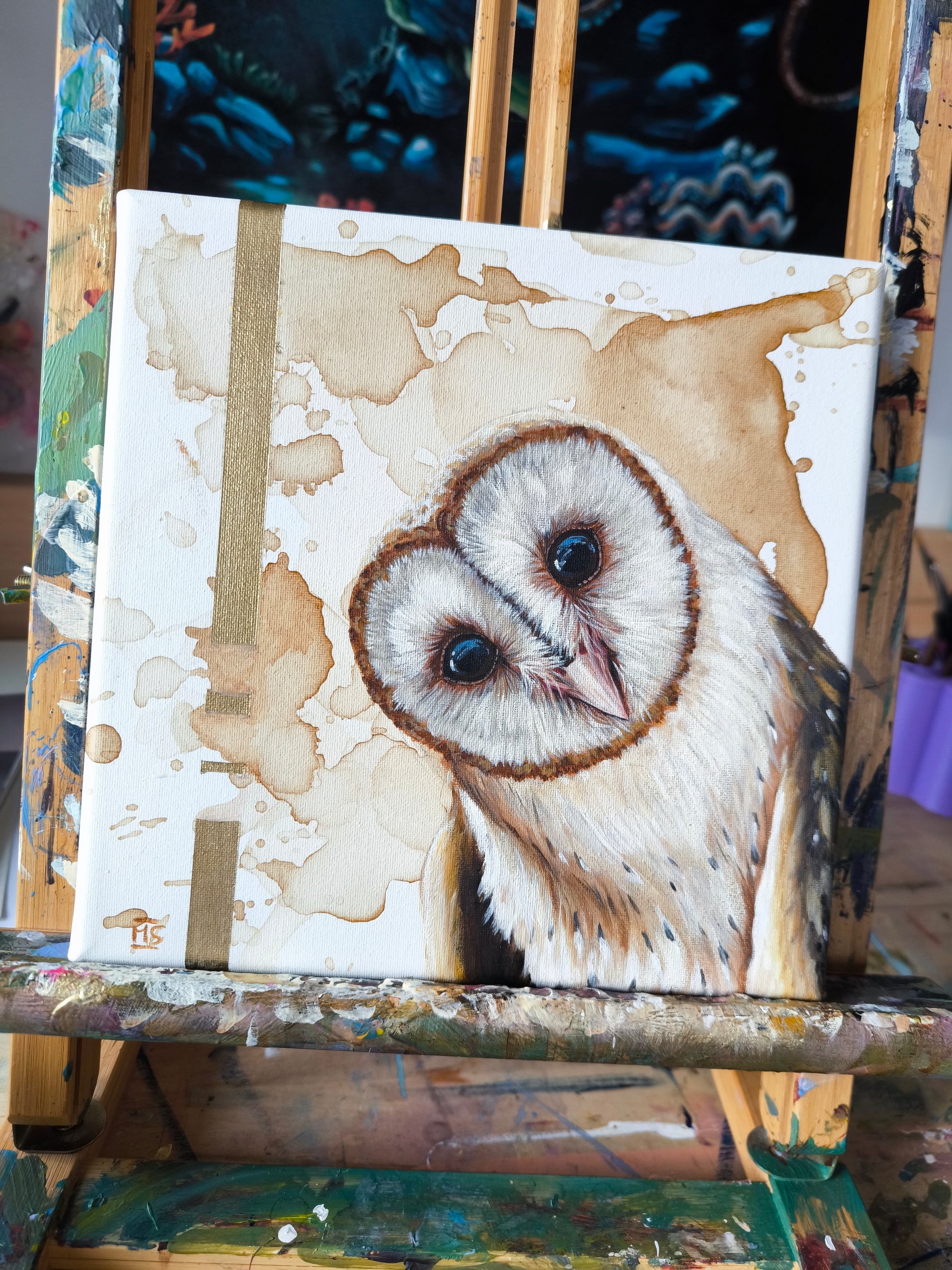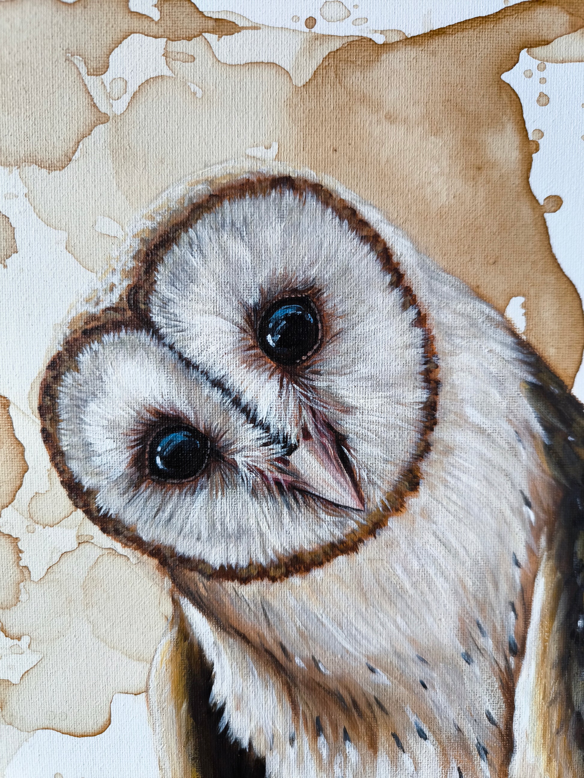 Das Kunstwerk ist eines aus meiner neuen Serie von 6 Kaffee Malereien, wo verschiedene Tiere nicht nur mit Erdigen Kaffee in Verbindung stehen, sondern auch den kühlen Metallpigmenten. Der "Eulenblick" wurde perfekt beschrieben mit den Worten " Sie schaut einen direkt ins Herz".