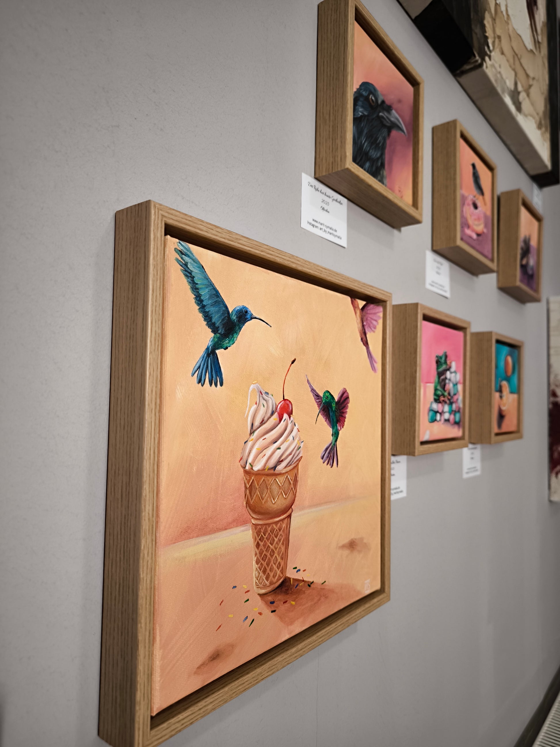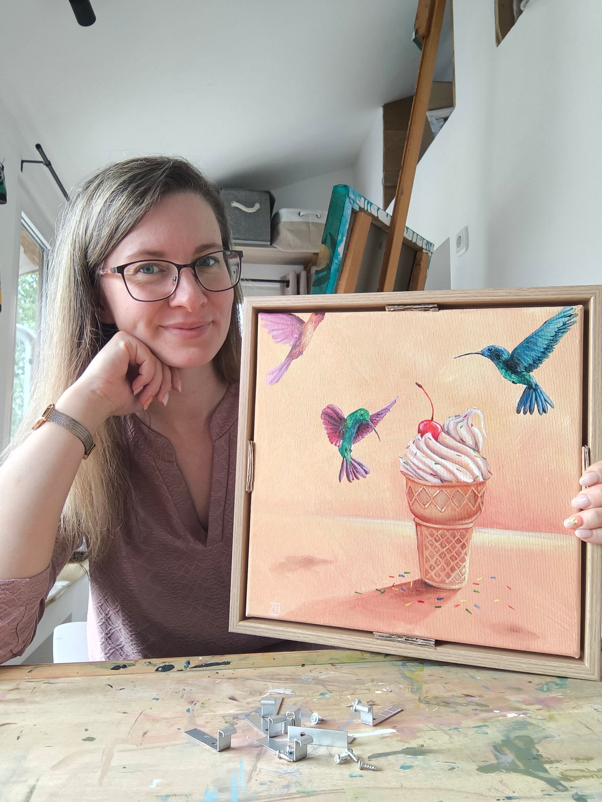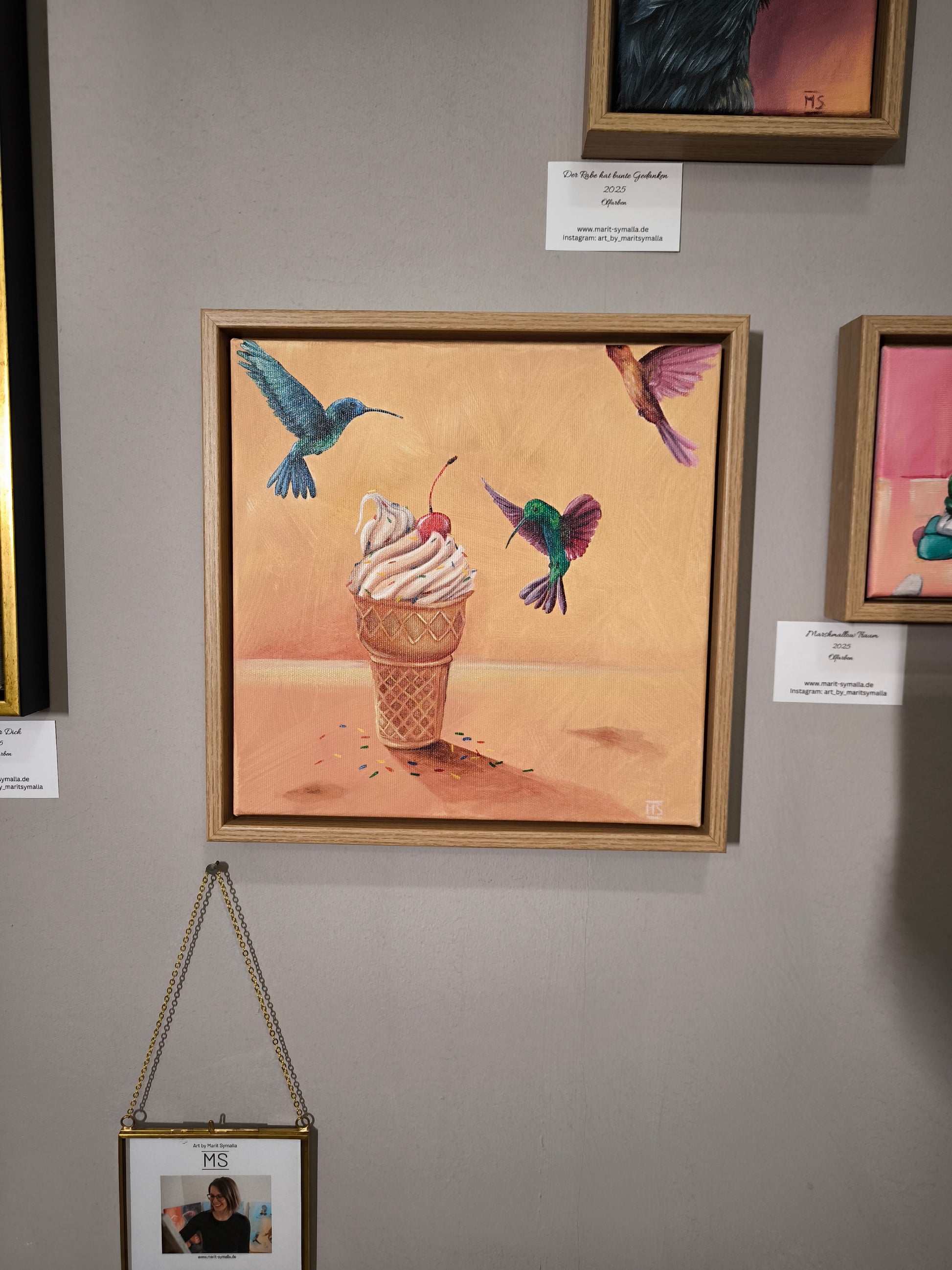 Es sind für mich Kindheitserinnerungen, Gedanken und Gefühle mit ein klein wenig Fantasie auf Leinwand. Die Begegnung zwischen Tieren und Naschereien die das Herz erwärmen. Ich möchte den Betrachter einladen genau solche Momente wieder zu entdecken.