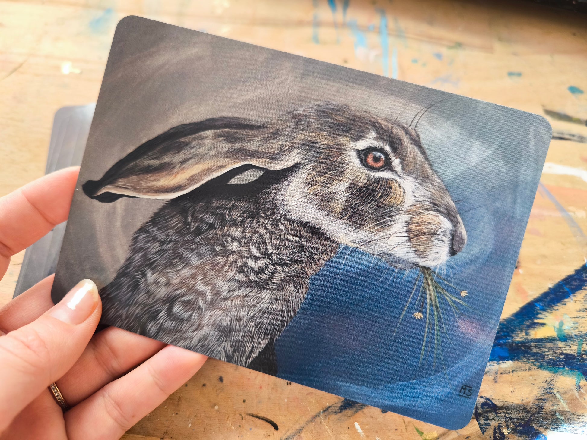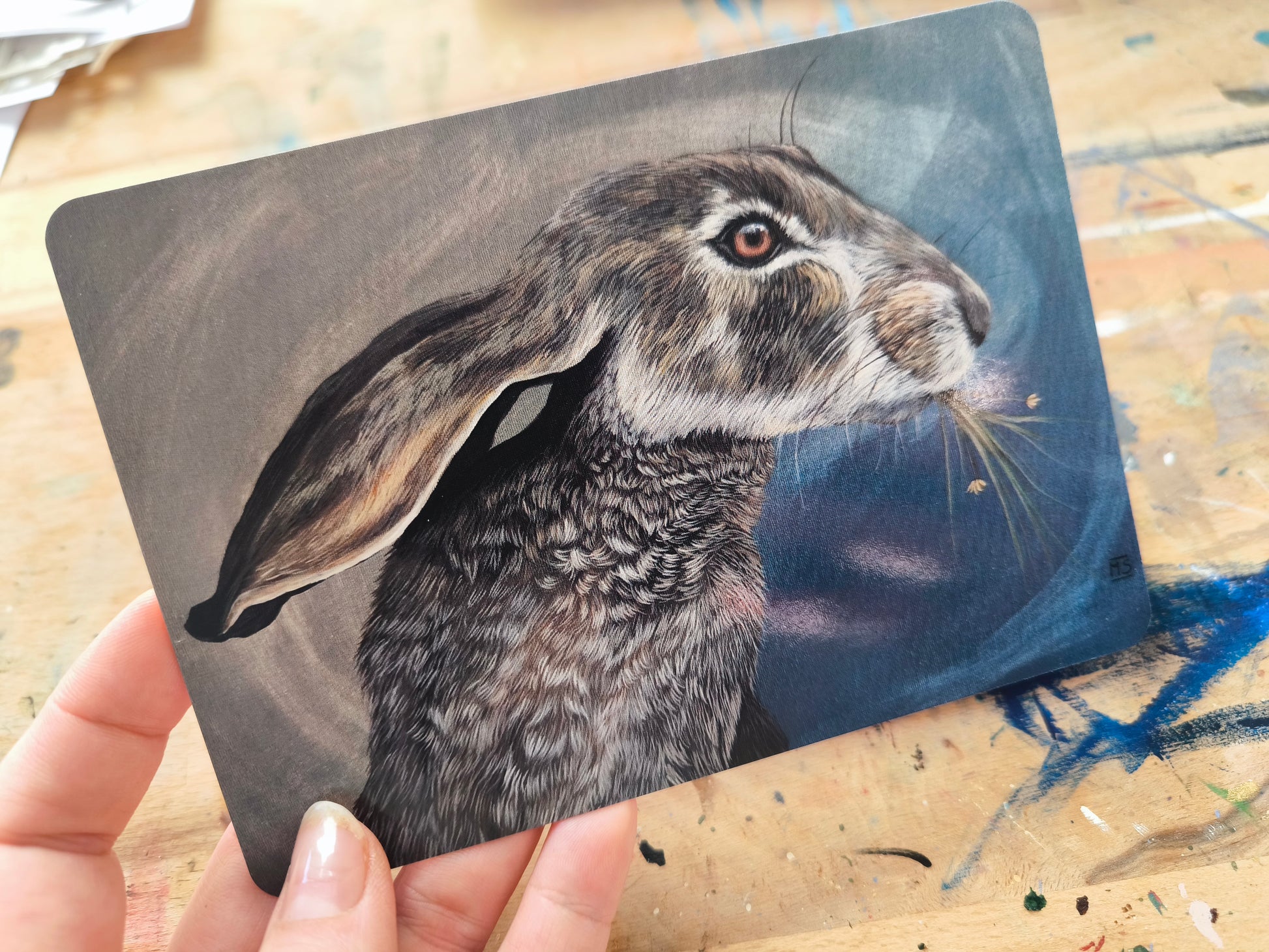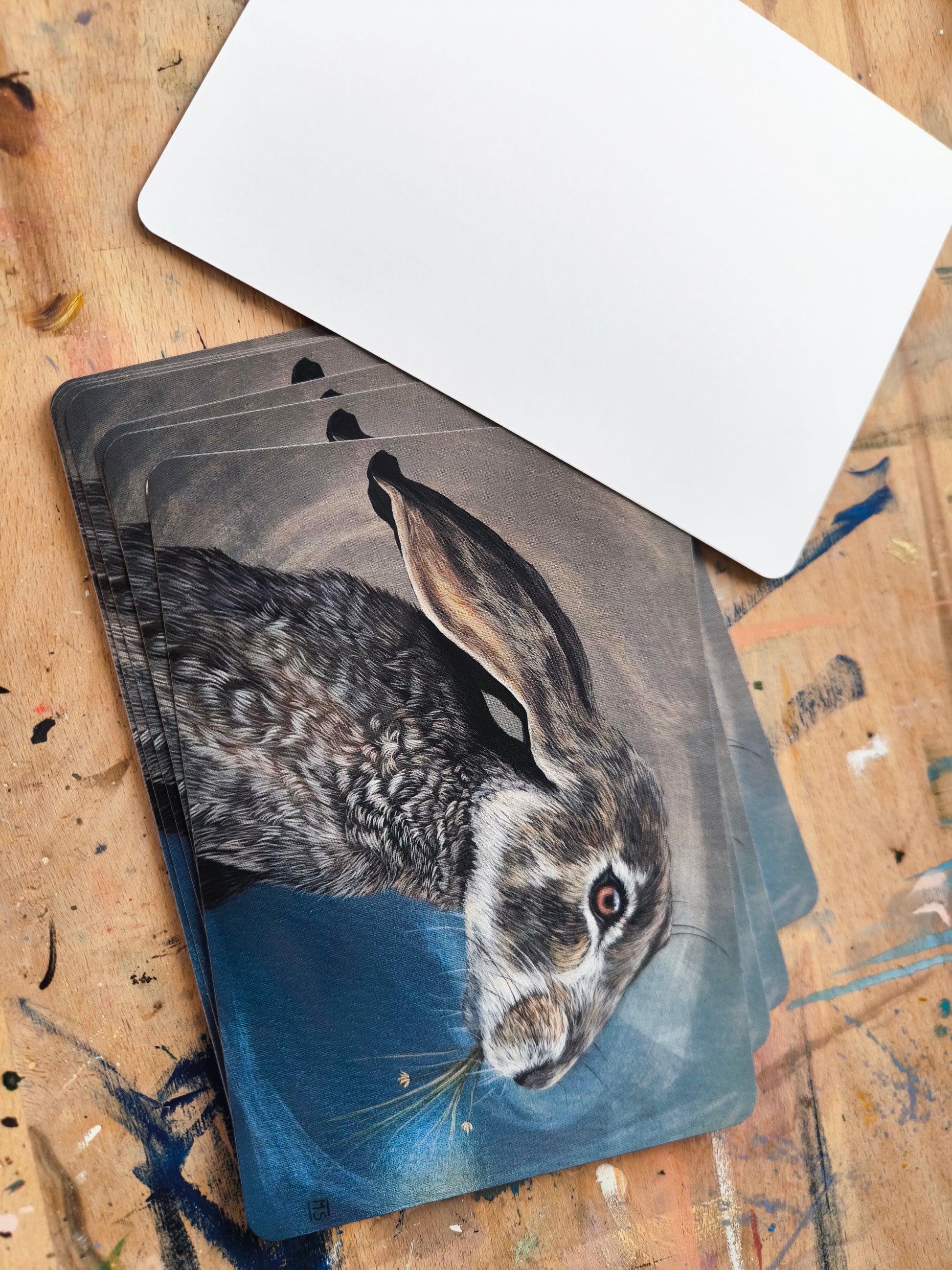 Postkartendrucke von dem Original Gemälden " Feldhase" mit abgerundeten Ecken.Der Druck ist auf Din A6, die Rückseite ist Leer.