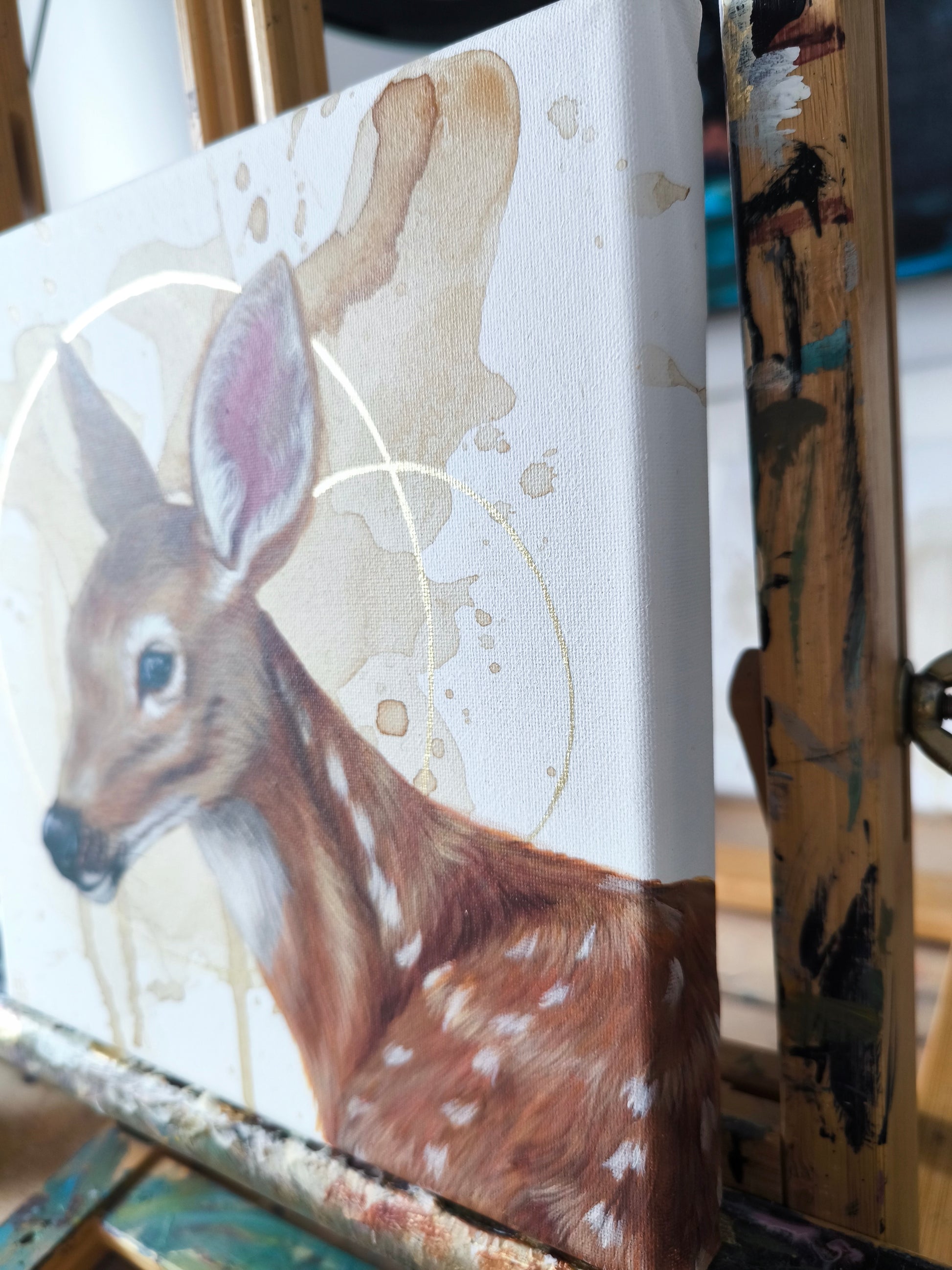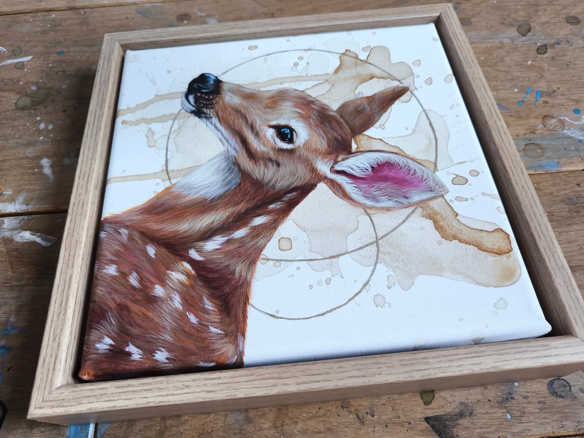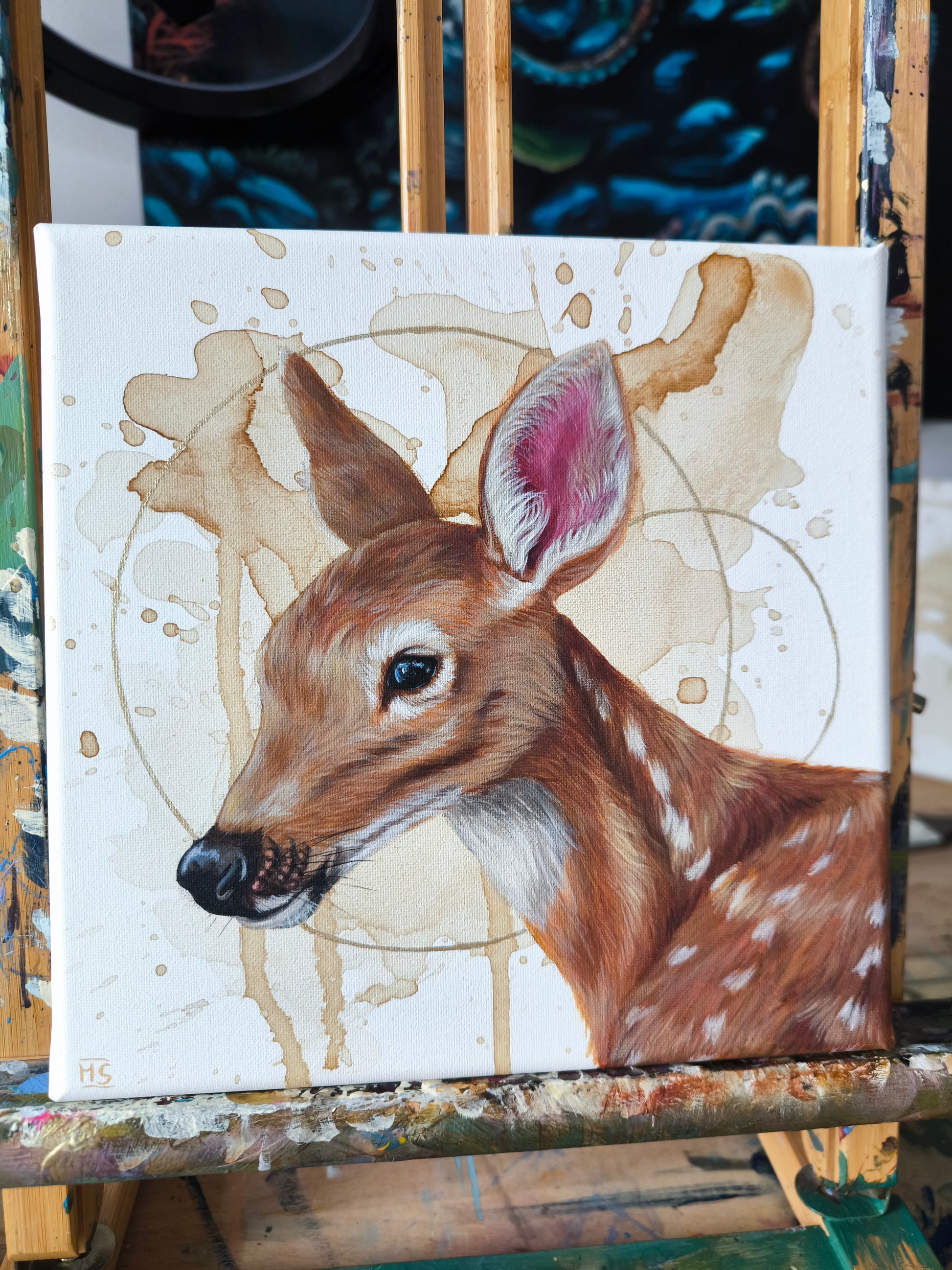 Das Kunstwerk ist eines aus meiner neuen Serie von 6 Kaffee Malereien, wo verschiedene Tiere nicht nur mit Erdigen Kaffee in Verbindung stehen, sondern auch den kühlen Metallpigmenten.