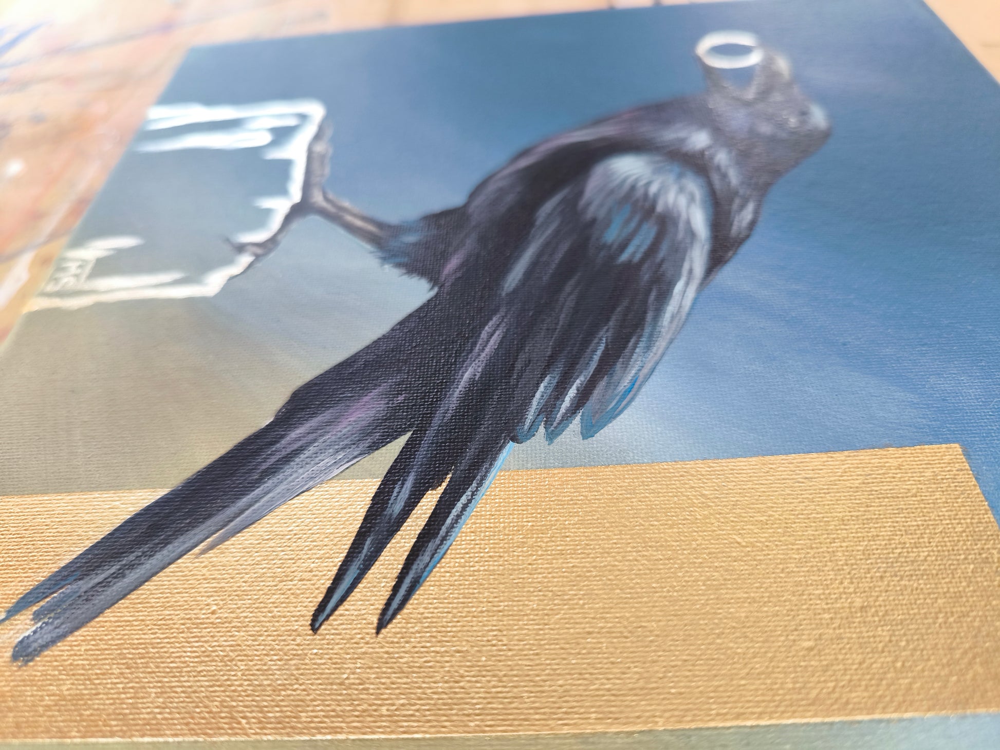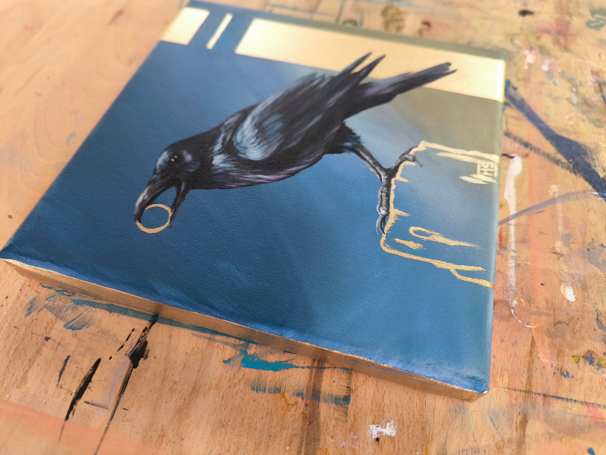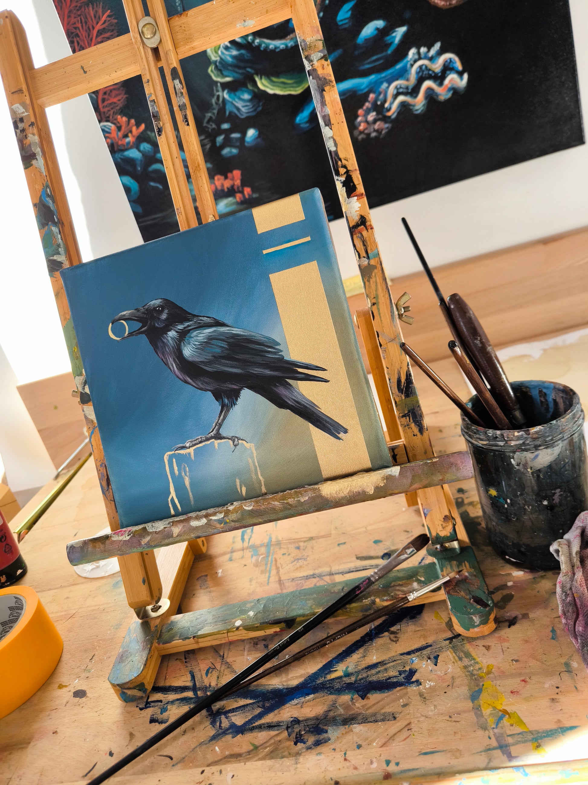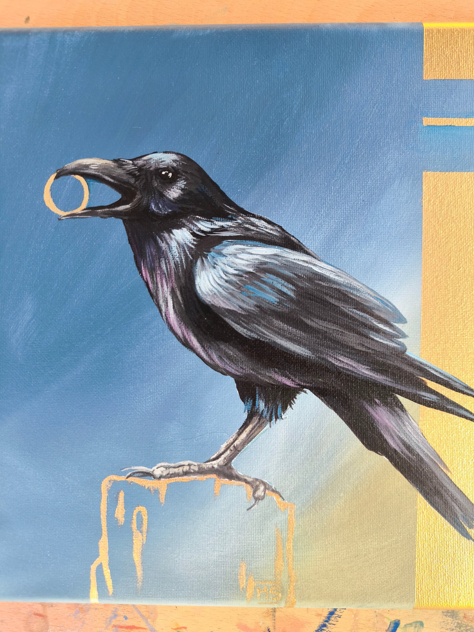 Ich liebe es, Raben zu malen. Ihre Symbolik, Intelligenz und die geheimnisvolle Ausstrahlung faszinieren mich immer wieder. Das Zusammenspiel von matten und glänzenden Flächen verleiht dem Bild Tiefe und eine besondere Atmosphäre.