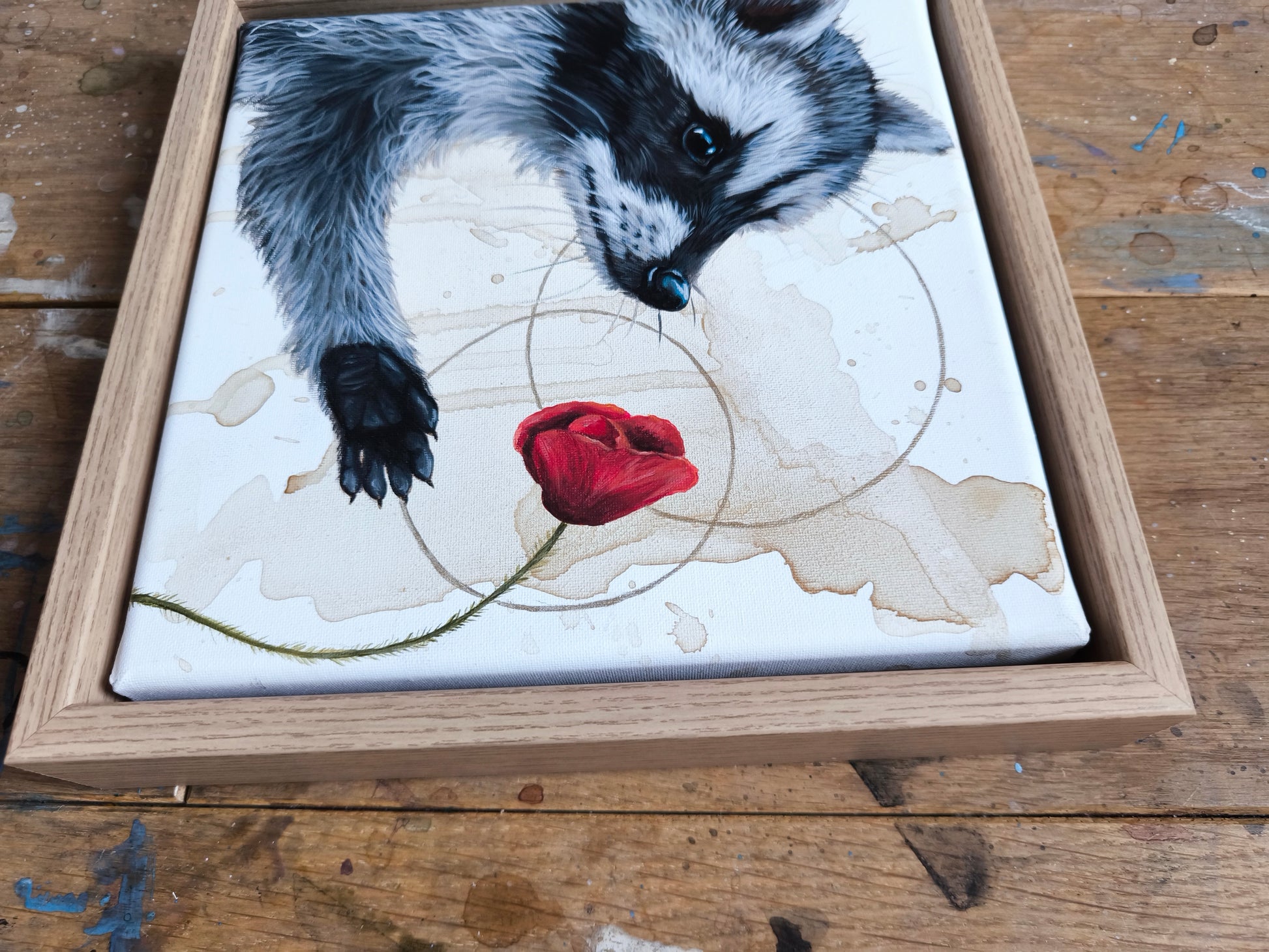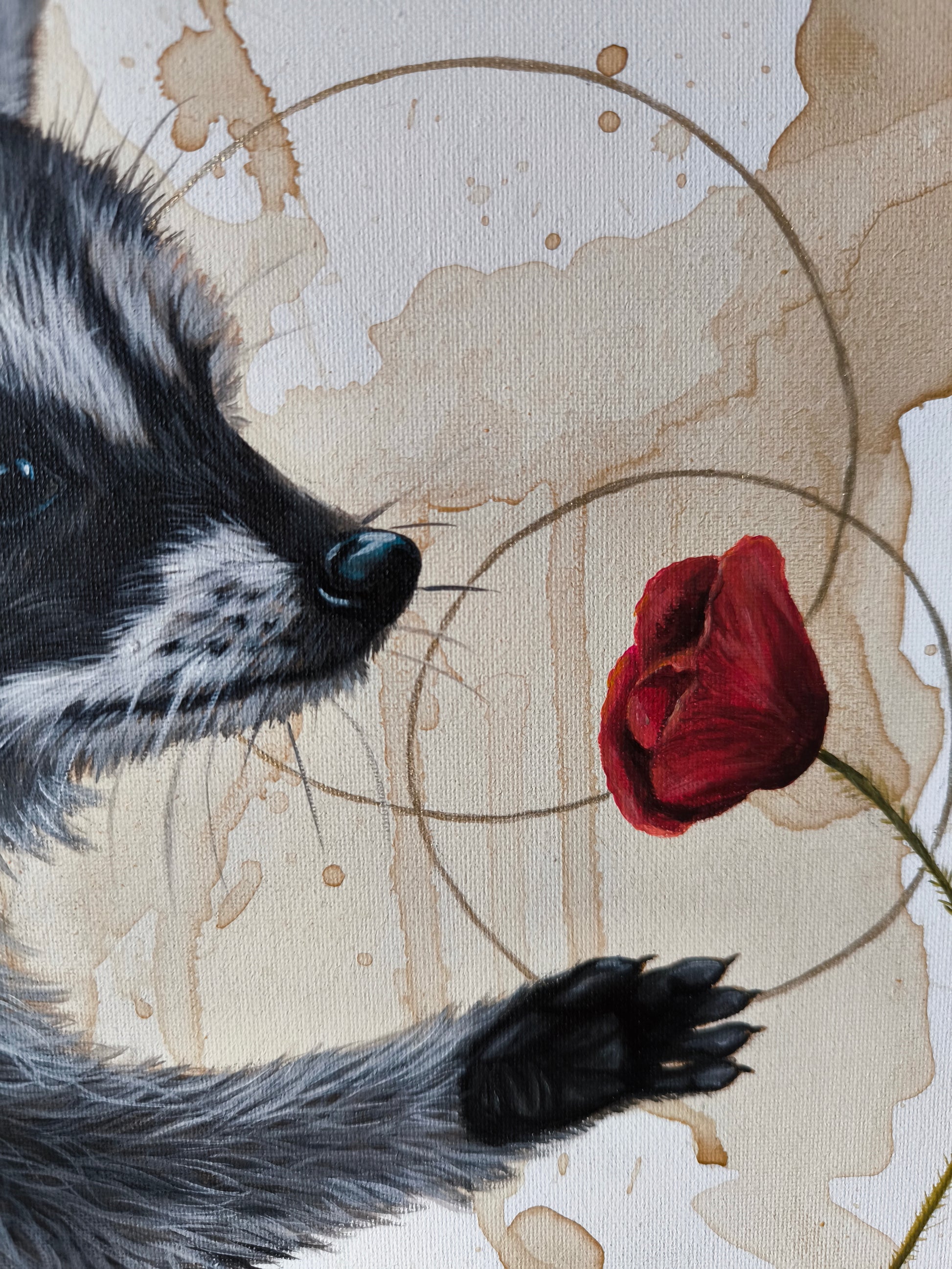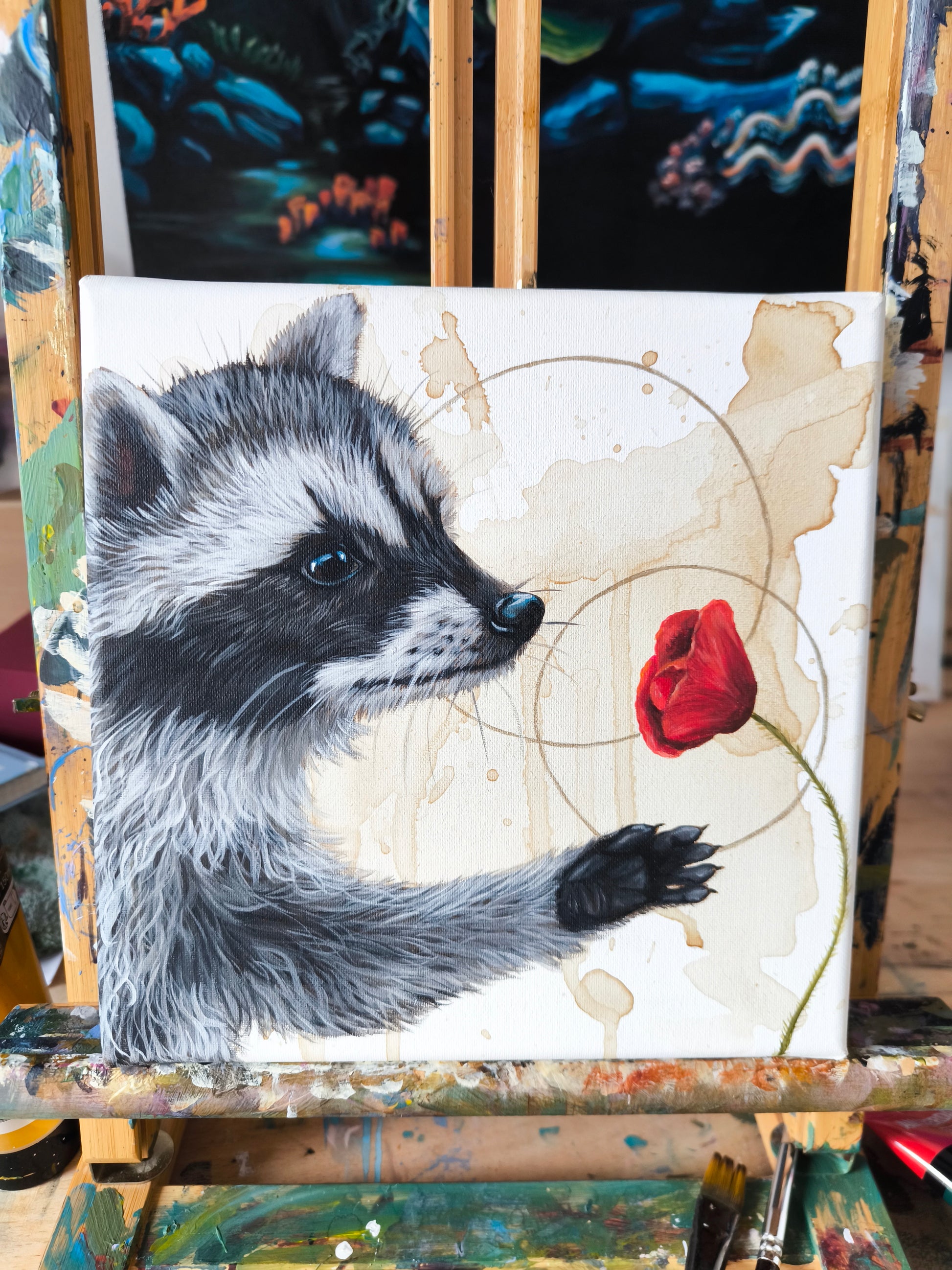 Der "verträumte Waschbär" gehört zu einer kleinen Serie von 6 Kaffee Malereien, wo verschiedene Tiere nicht nur mit Erdigen Kaffee in Verbindung stehen, sondern auch den kühlen Metallpigmenten.