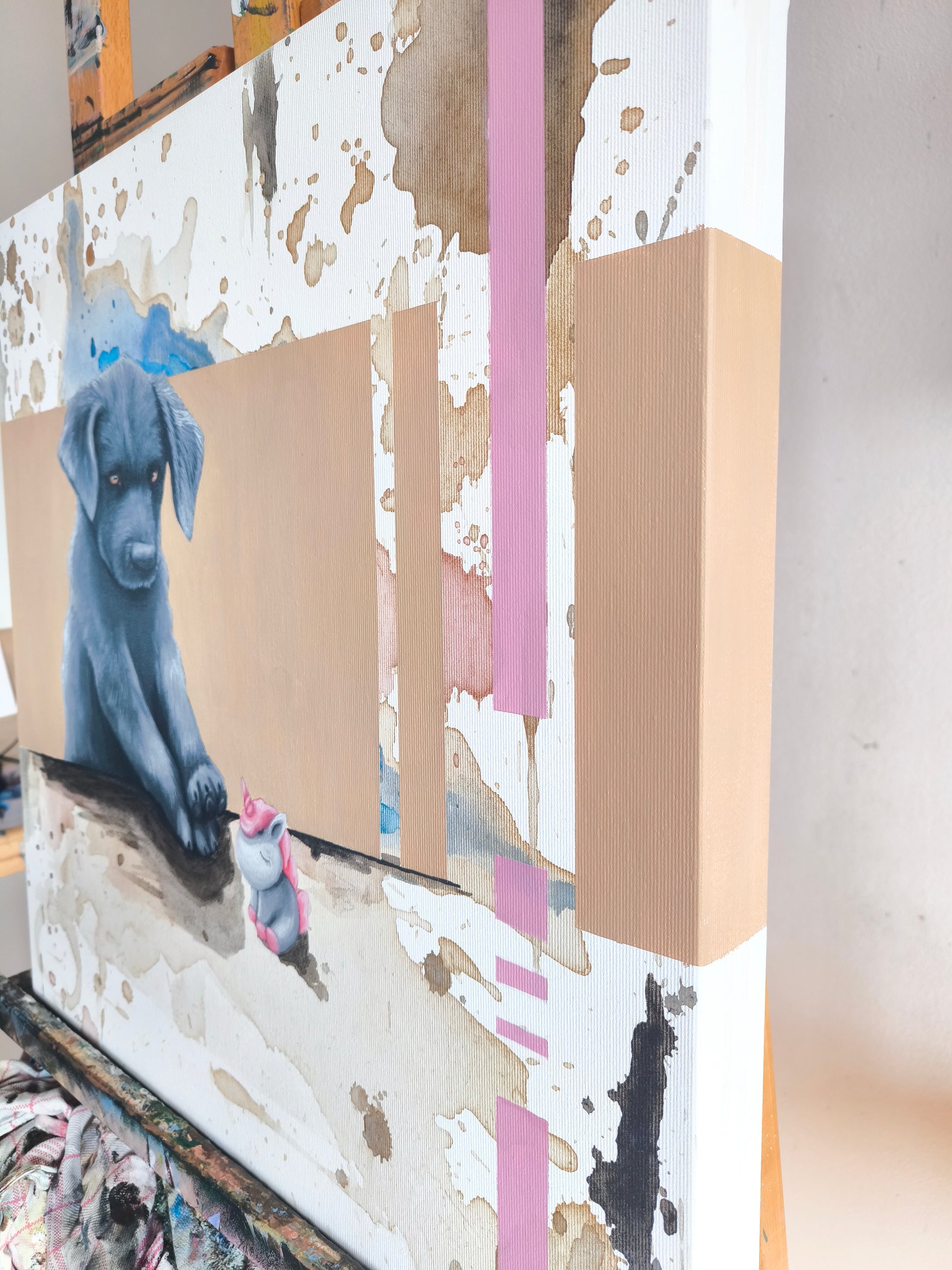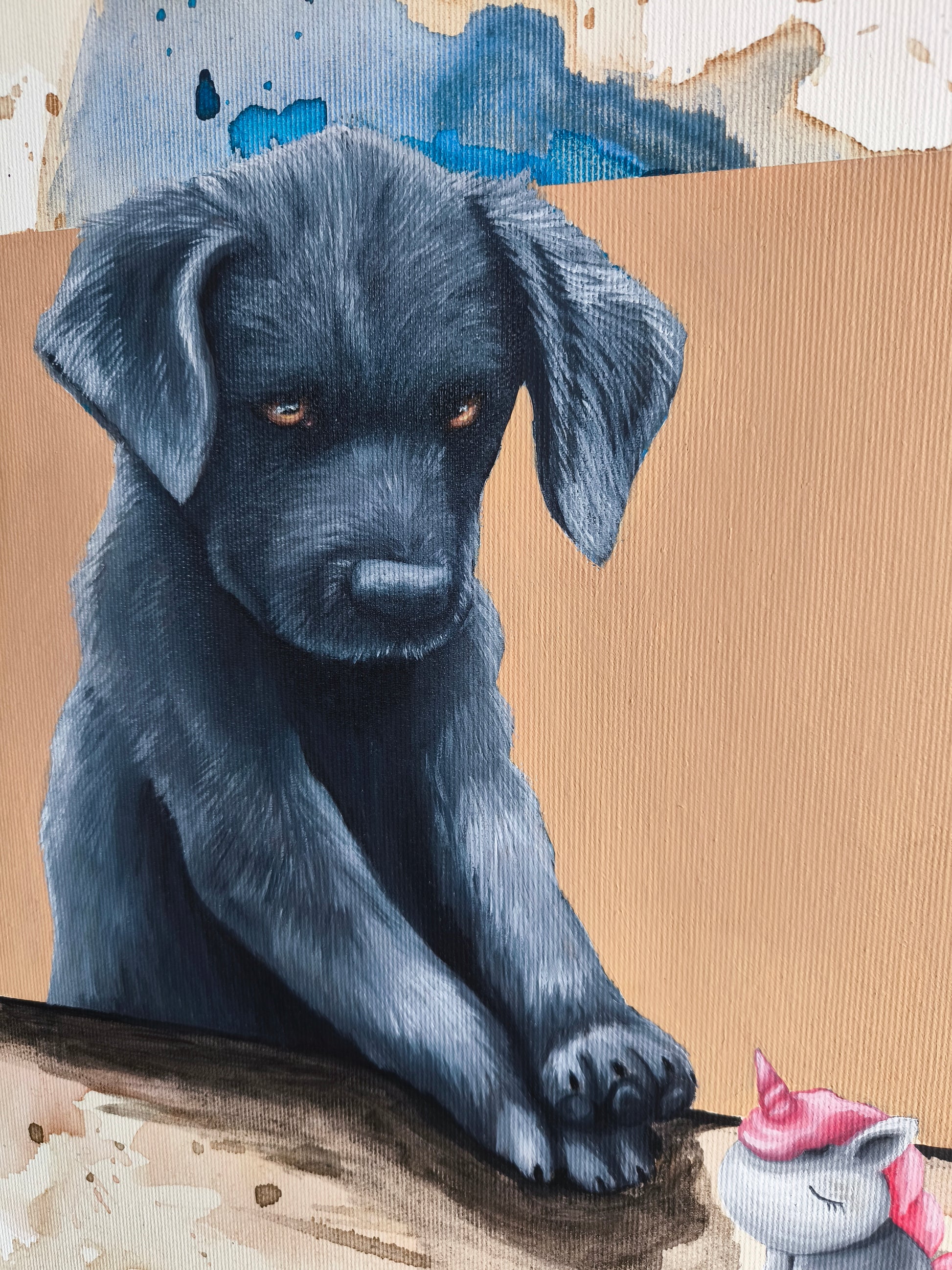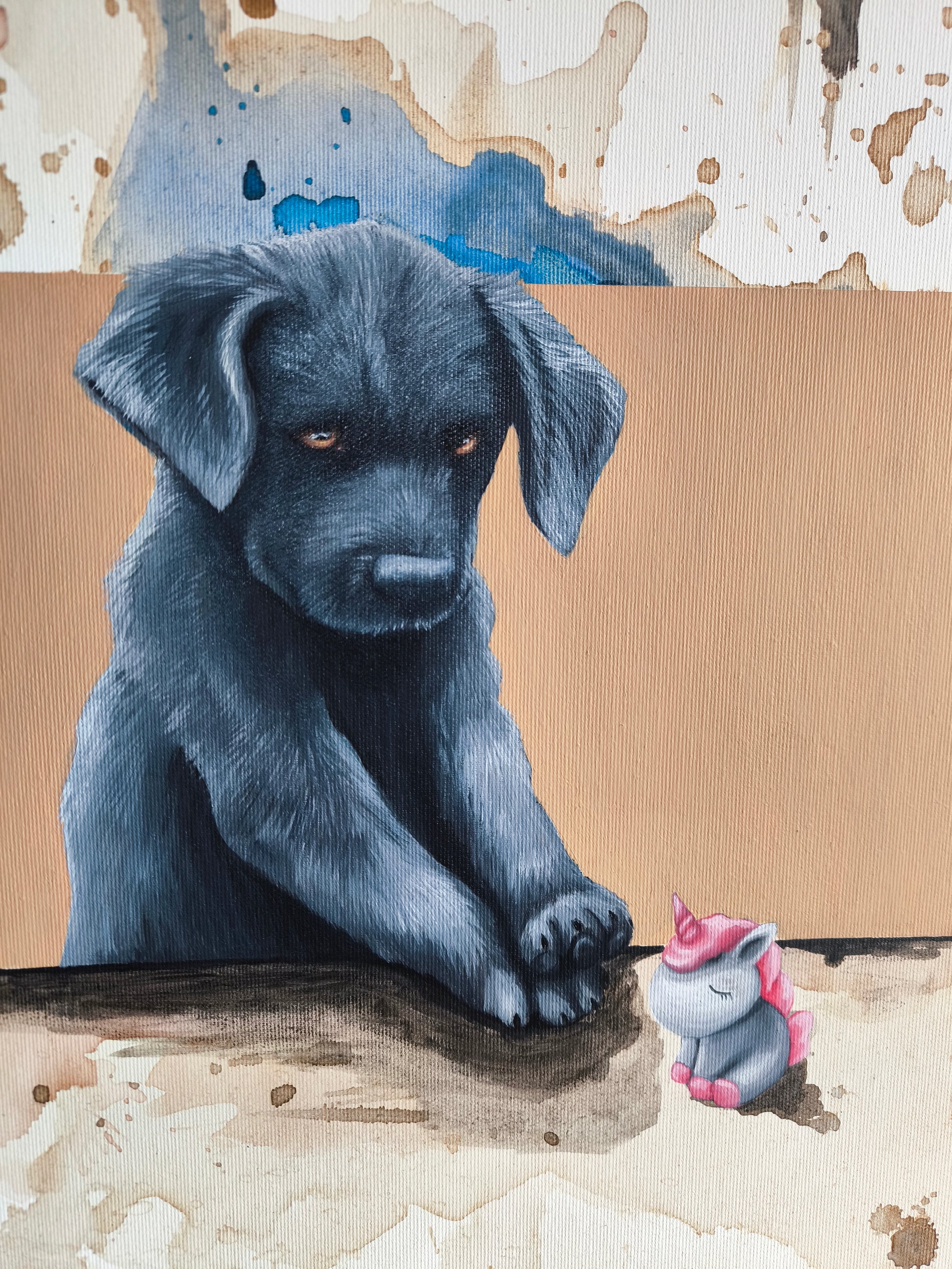 Es ist eine Mischung aus Neugier, Mut und kindlicher Unschuld. Die warmen Kaffee Töne und bunten Flecken sind zufällige Spuren einer Erinnerung...